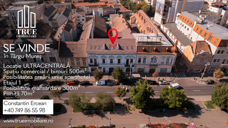 True Imobiliare vă prezintă spre vânzare în exclusivitate un spațiu comercial de 500m² + 350m², ultracentral, Târgu Mureș.